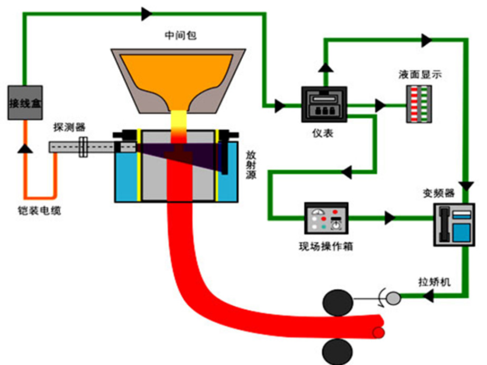 تم تبني CS-137 وكاشفات حساسة للغاية للكشف عن مستوى الصلب المنصهر والتحكم فيه في آلة الصب المستمرة البليت الصغيرة.