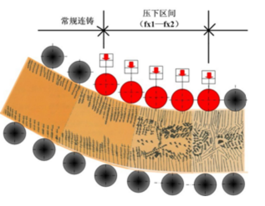من خلال تطبيق قدر معين من الحد من الضغط على منطقة نهاية التصلب من البليت المصبوب ، يمكن تقليل الفصل المركزي ومسامية البليت المصبوب أو القضاء عليه ، والذي ينقسم إلى نوعين: الحد من ضغط الضوء وتقليل الضغط الثقيل.